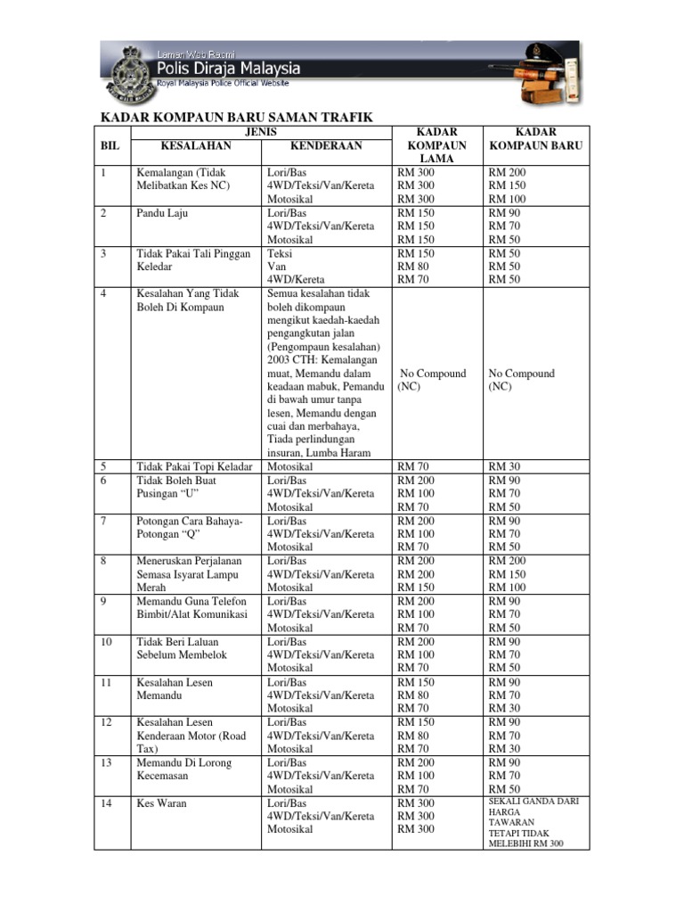Kadar kompaun baru saman trafik adalah untuk semua. Terpaksa jelaskan saman mengikut kadar harga biasa yang telah ditetapkan. KADAR KOMPAUN BARU SAMAN TRAFIK JENIS BIL KESALAHAN KENDERAAN KADAR KOMPAUN LAMA KADAR KOMPAUN BARU 1 Kemalangan Tidak Melibatkan Kes NC LoriBas 4WDTeksiVanKereta Motosikal RM 300.